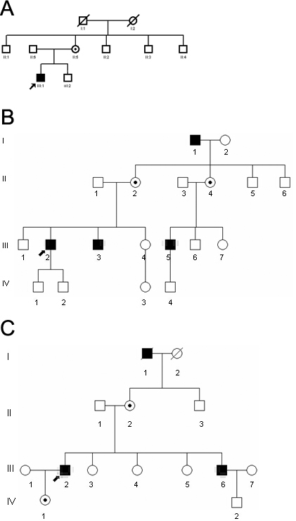 carriers. Arrows indicate probands. Slash indicates deceased person.