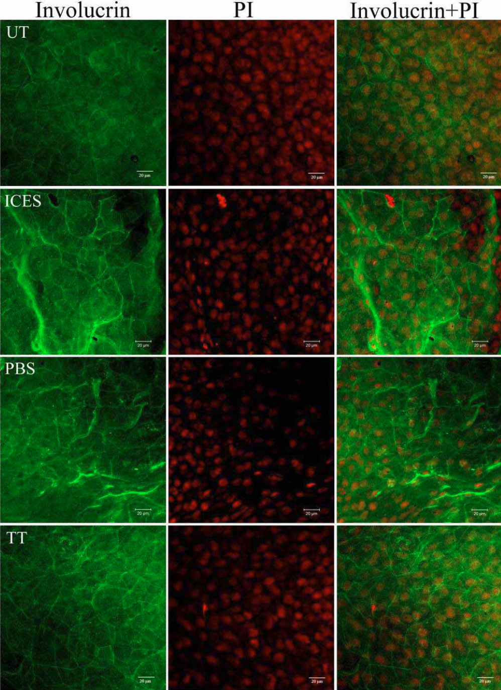 Immunofluorescent staining of whole-mounted corneas stained for involucrin.