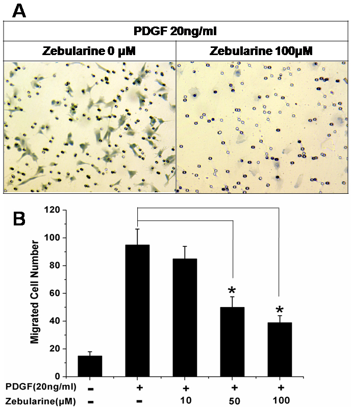 significantly increased in response to PDGF stimulation. PDGF-induced LECs migration was inhibited by Zebularine (A) in a dose-dependent manner (B). The maximal inhibition (58.9±6.1%) was seen at 100 μM Zebularine (p<0.01). *p<0.01, Error bar indicates mean±SEM.