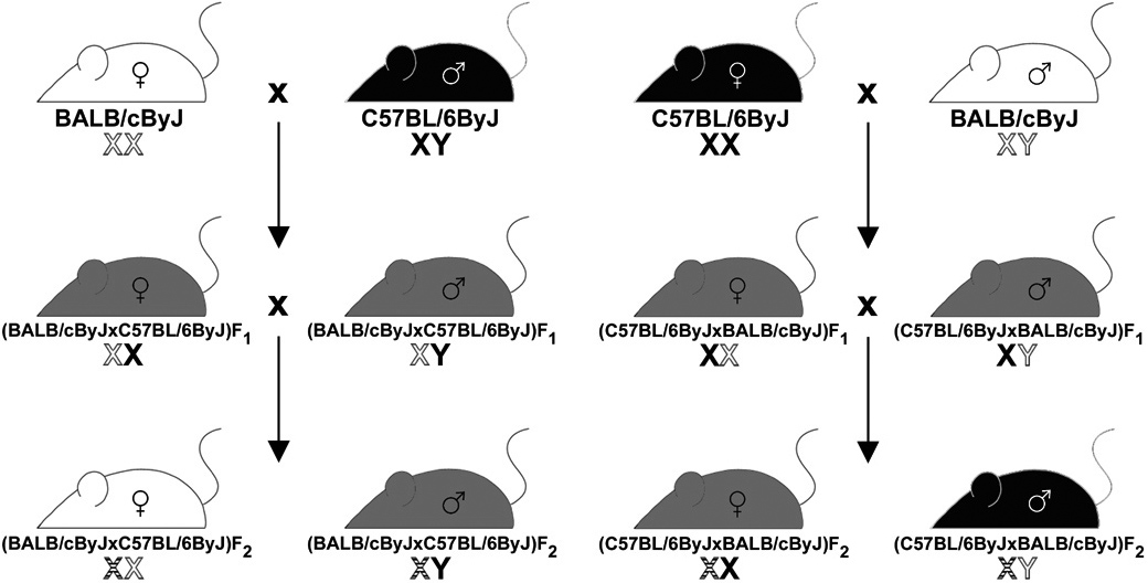 Figure 1. Illustration of the breeding scheme used in the mapping cross. The BALB/cByJ and C57BL/6ByJ parental strains are crossed in