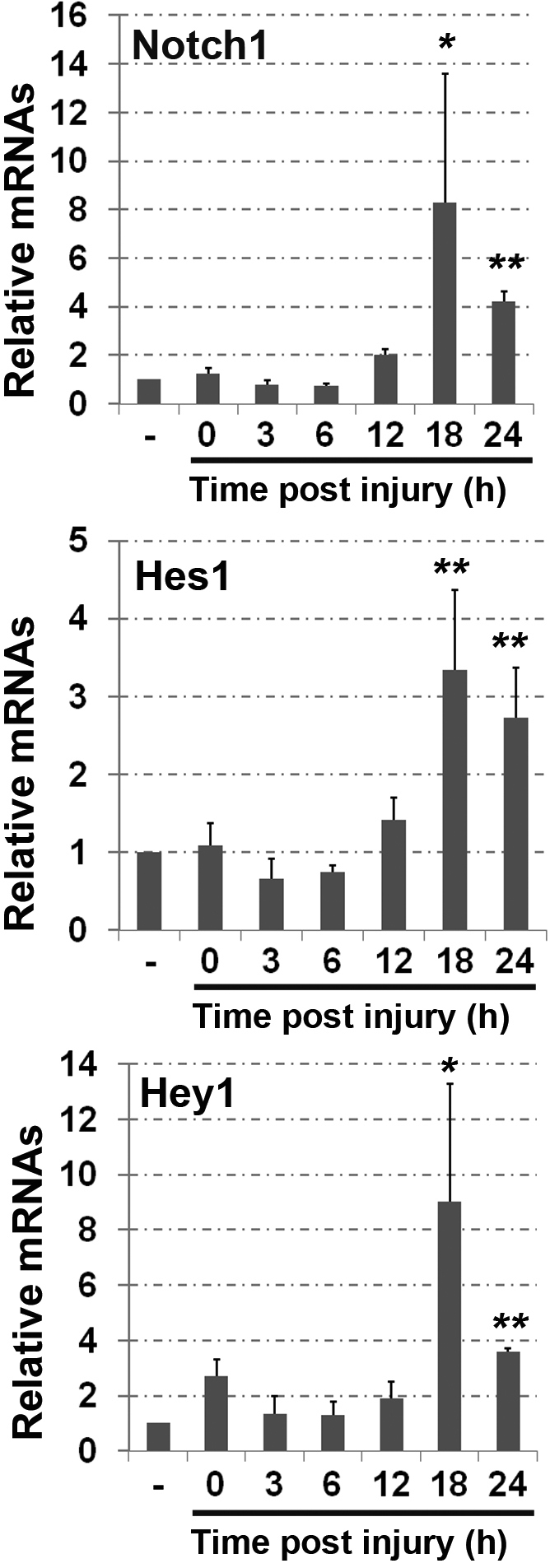 Figure 5. Upregulation of Notch1, Hes1, and Hey1 during wound healing response in WT mice. Rea-time qPCR analysis of Notch1, Hes1, and Hey1 mRNA expression performed in WT cornea tissues collected from no-injured corneas and corneas at 0, 3, 6, 12, 18, and 24 h