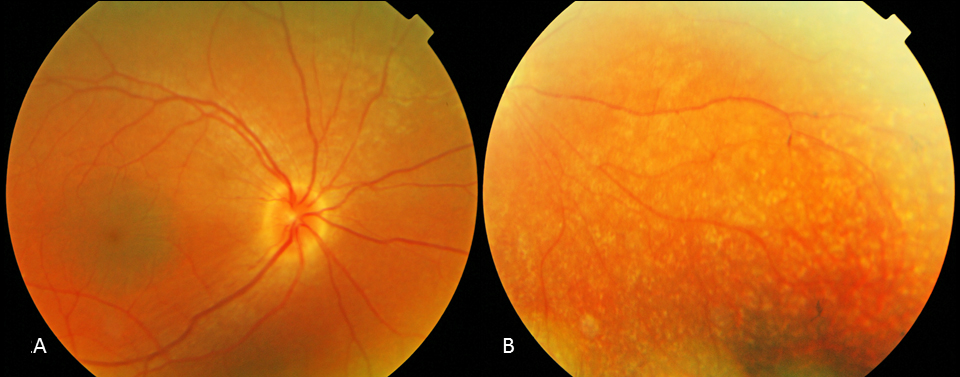 with greyish, darker appearance of the macula with subtle wrinkling of the inner limiting membrane. B: Note the subtle, atrophic, well defined dot-like changes at the level of the RPE and the bone spicules in the periphery.