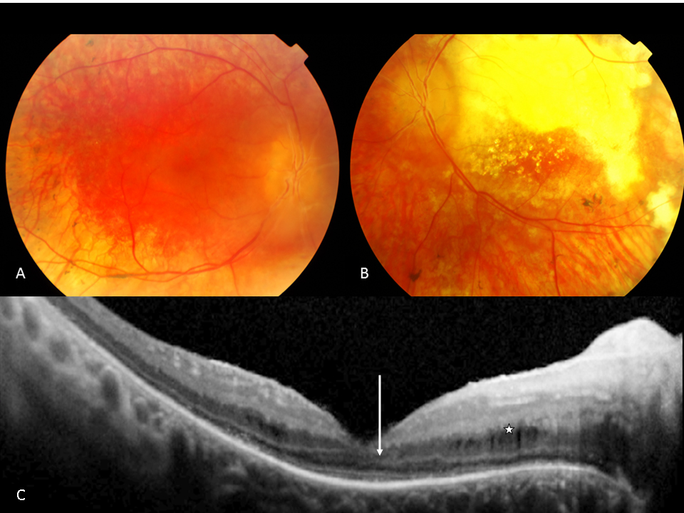 eye. B: Note the exudation in the posterior pole with shallow detachment in the left eye. C: Spectralis optical coherence tomography (OCT) image of the macular region of the right eye showing cyst-like changes (*)