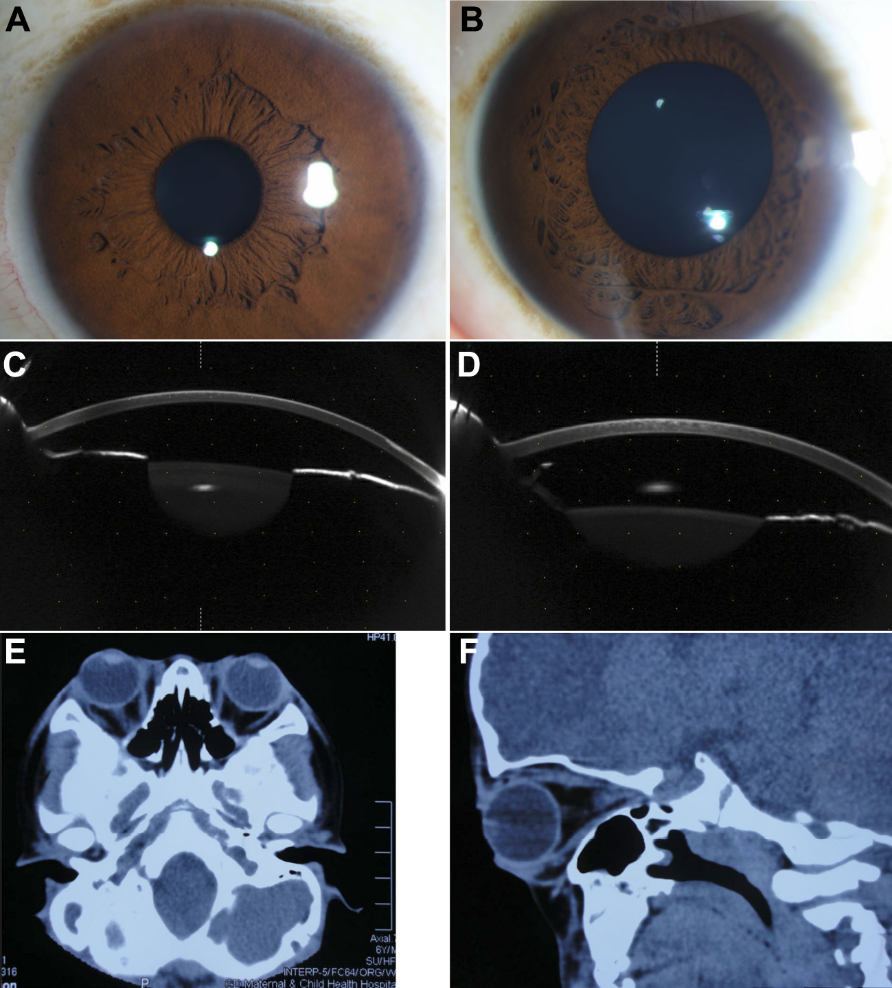 Figure 3. Examination results of II-3 and III-1. A: Anterior segment photograph of II-3. B: Anterior segment photograph of III-1. C: The anterior segment picture of II-3 by Pentacam. D: The anterior segment picture of III-1 by Pentacam. E, F: Shallow orbits and ocular proptosis of III-1 using computed tomography (CT).
