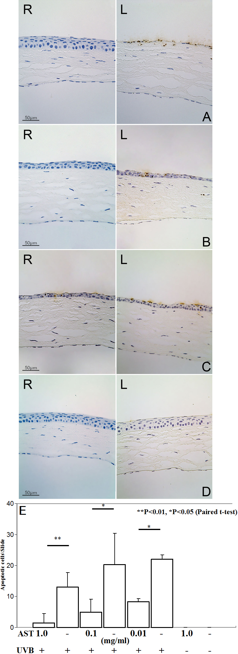 Figure 3. TUNEL labeling at irradiated corneas with and without AST-treatment. Eyes were treated with AST eye drops before UV exposure