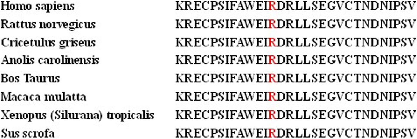 Multiple-sequence alignment in PAX6 from 8 different species. It demonstrates that R103 is highly conserved (highlighted in red).