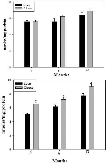Figure 3. Protein carbonyl content in soluble protein fraction of WNIN/Ob (top panel) and WNIN/GR-Ob rats (bottom panel) at different