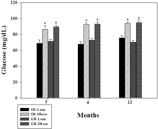 Plasma glucose levels of WNIN/Ob and WNIN/GR-Ob rats at different ages. Data are mean±SE (n=6). The asterisk (*) above the bars denotes that data are significantly different between lean and obese rats at the respective age.