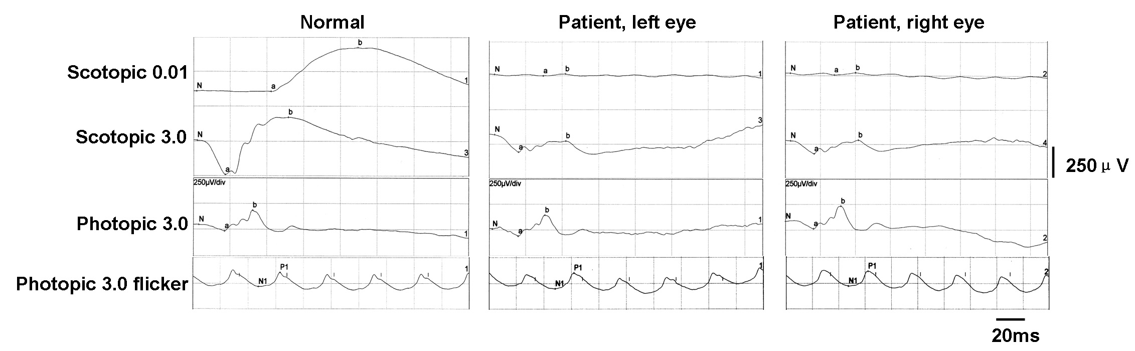 Oguchi’s disease. The rod b waves were nearly undetectable in