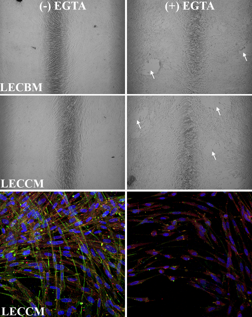 (LECBM) or lens epithelial cell-conditioned medium (LECCM). Arrows in the (+) EGTA images indicate large spaces between cells.