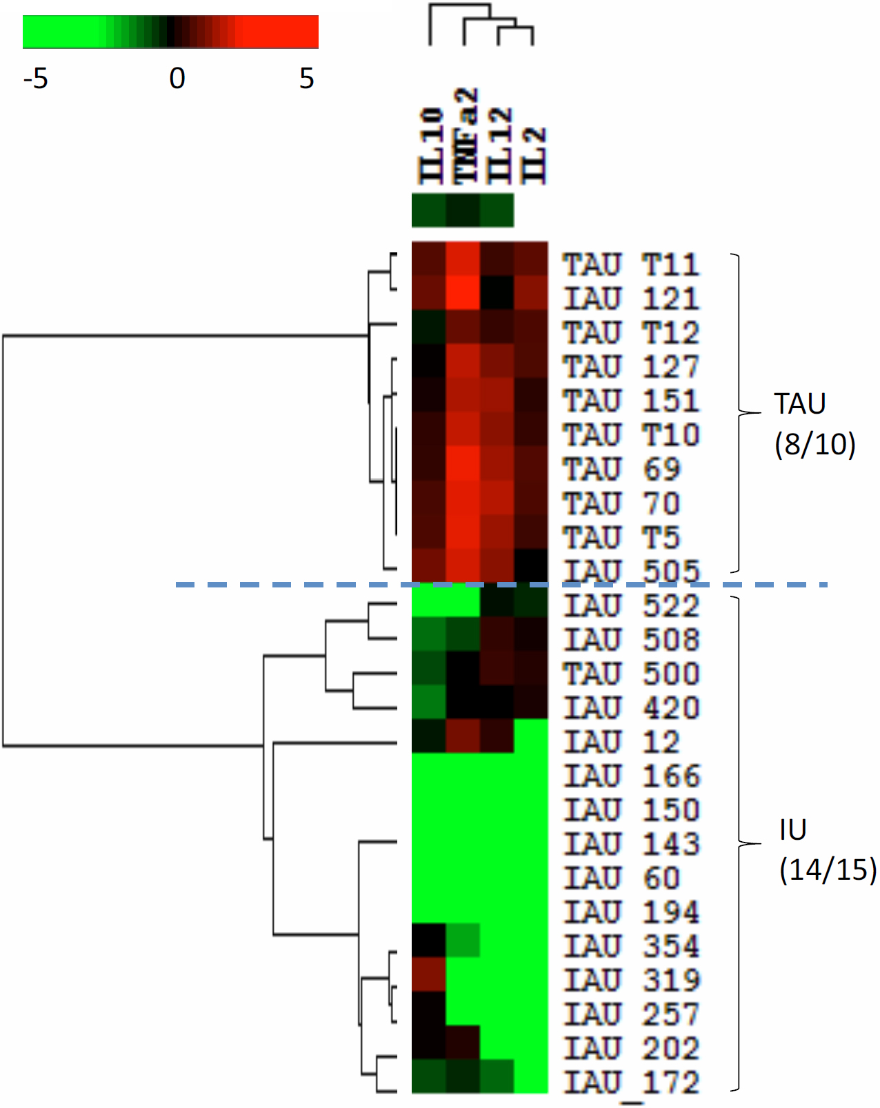 Heat-map analysis comparing uveitis associated with tuberculosis (TAU) and idiopathic uveitis (IU). The combination of IL-10, TNF-α, IL-12, and IL-2 separated TAU from IU with an accuracy of 80% for TAU and 93% for IU.