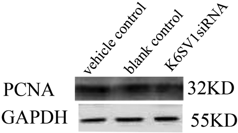 decreased in HLEC transfected with pKLF6SV1 siRNA (lane 2) compared with blank control (lane 3) and vehicle control (lane 1).