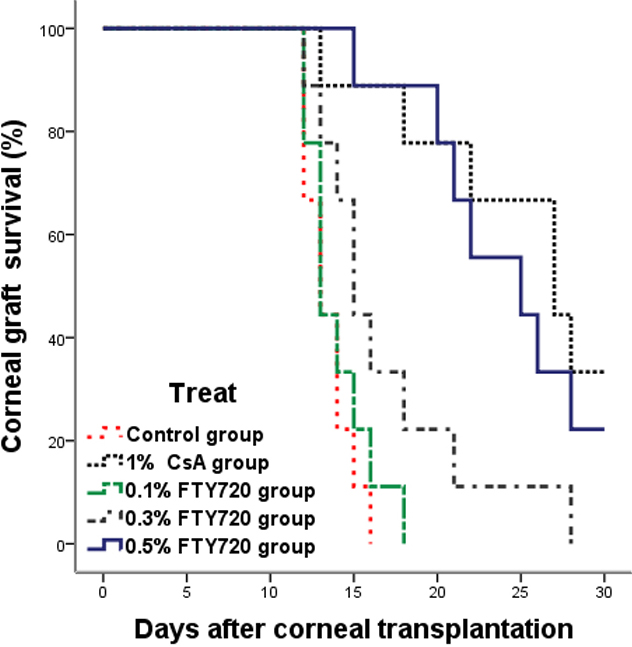 n=9). Treatment with 0.5% FTY720 or 1% CsA also resulted in significant graft survival compared to controls (both p<0.01;