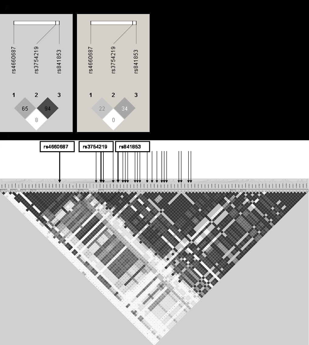 Figure 1. Linkage disequilibrium (LD) display in Haploview of (