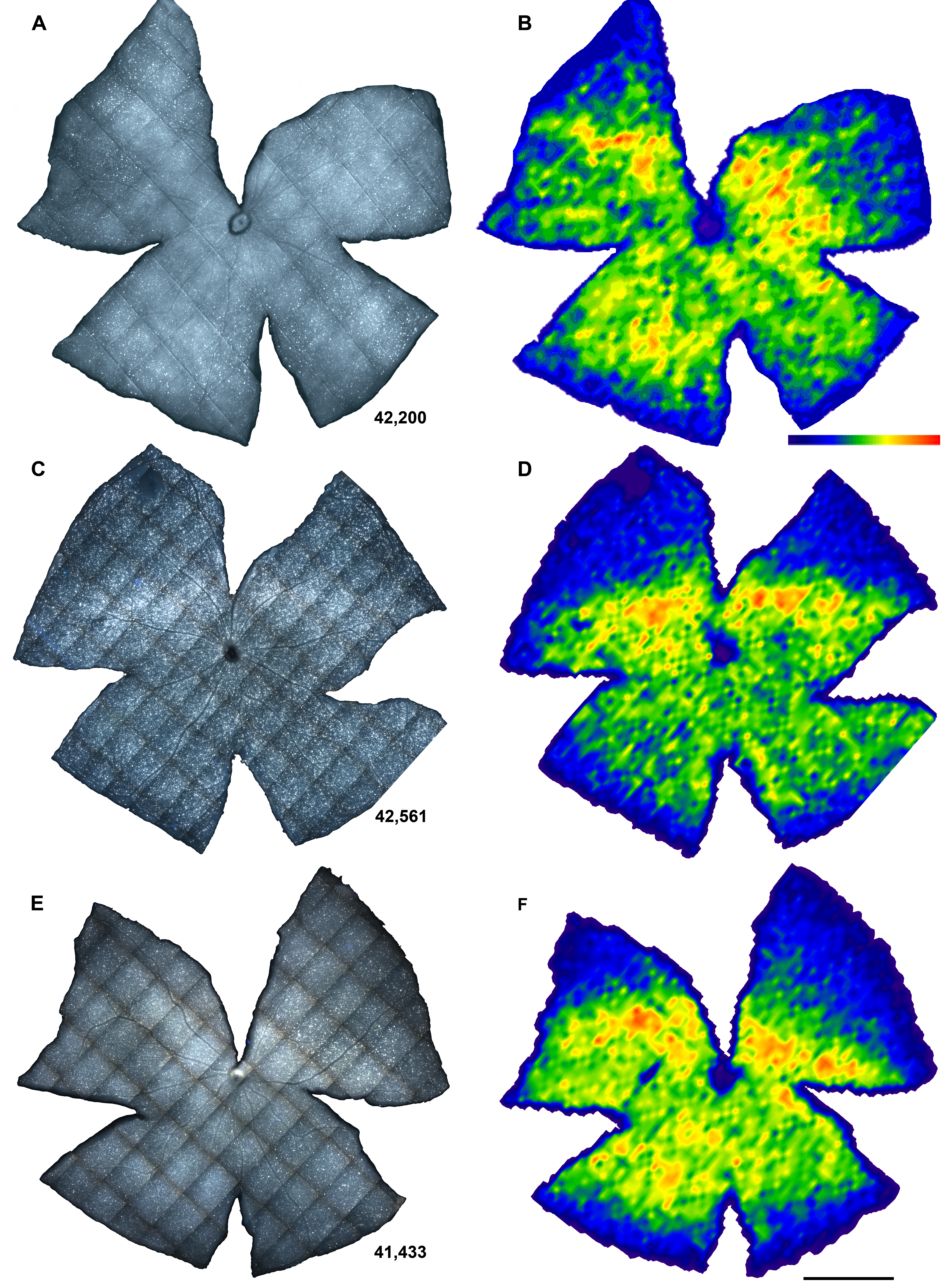 (red) RGCs/mm2 (B bottom). The numbers of RGCs in