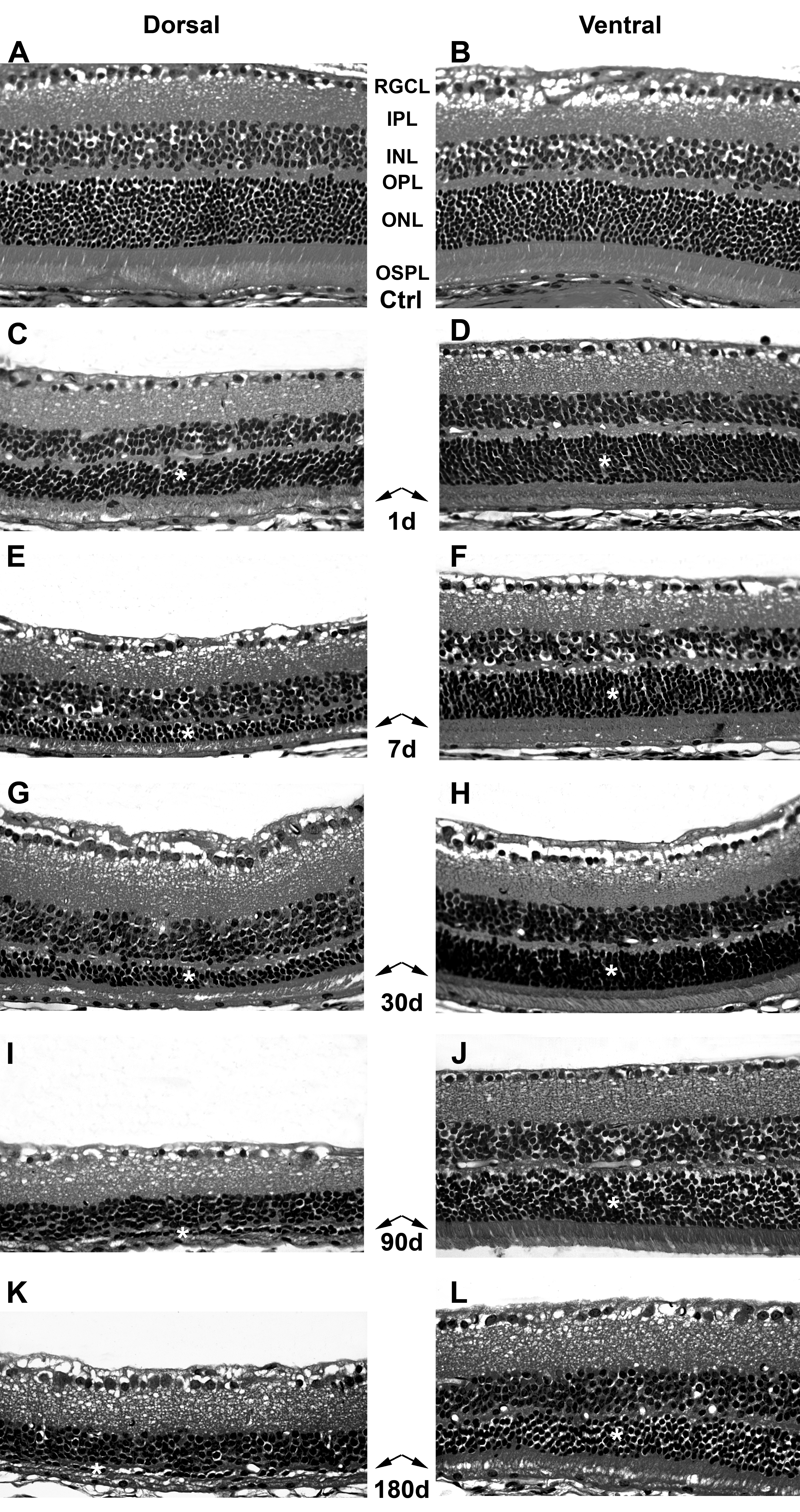 stained retinal cross sections from the dorsal (left column) and
