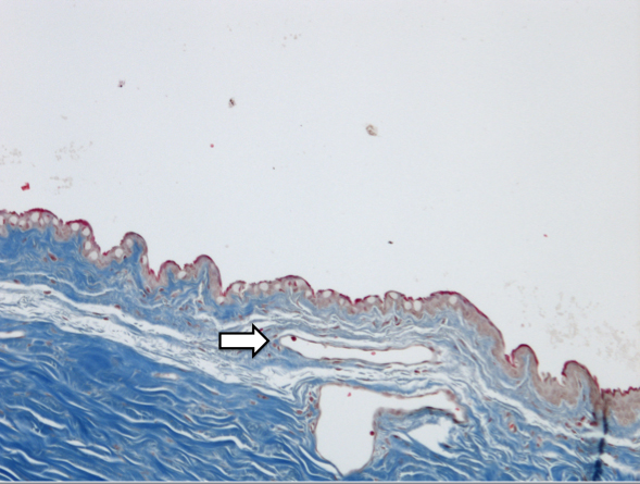 Histologic analysis of bleb tissue revealed less collagen deposition with Masson Trichrome stain compared to the BSS control as well as a thin capsule (white arrow) at the location of the Ozurdex