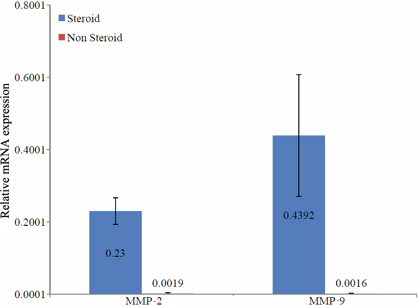 Figure 1. Expression of MMP-2 and MMP-9 mRNA in steroid and non-steroid induced PSC. The graph represents the quantitative analysis of MMP-2 and MMP-9 mRNA expression and both are higher in the LECs of steroid-induced PSC as compared to non-steroid induced PSC.