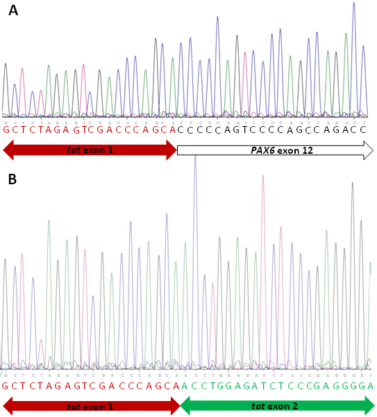 construct (A) and the mutant c.1183+5 A-allele plasmid construct (B). A: Red letters indicate the tat exon 1 sequence and black letters indicate sequence of PAX6 exon 12. B: Red letters indicate the tat exon 1 sequence and green letters indicate the tat exon 2 sequence.