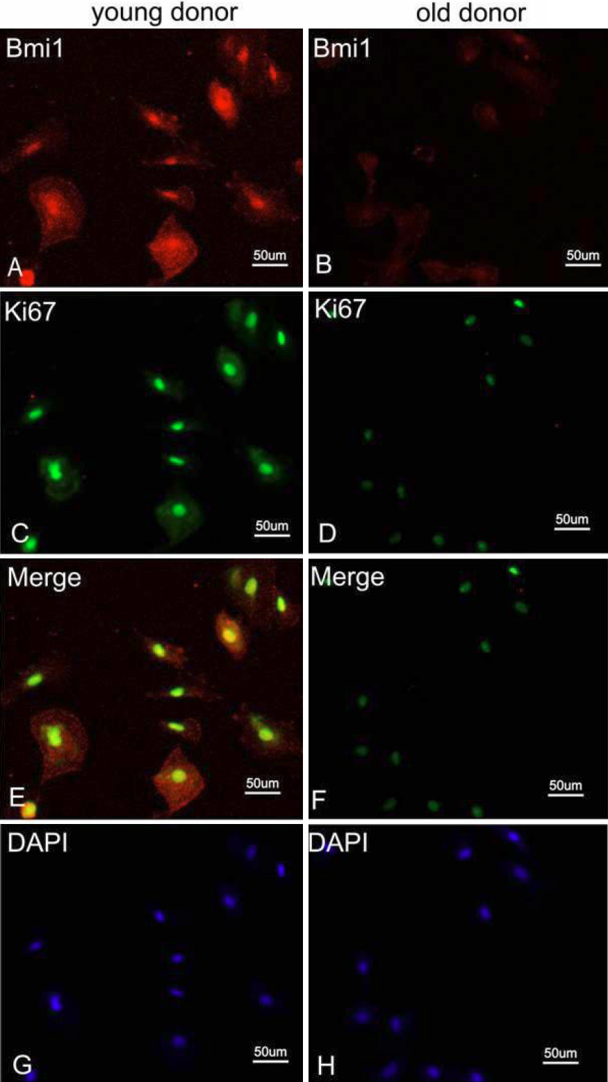from a donor younger than 30 years of age (A, C, and E) and from a donor older than 50 years of age (B, D, and F). Panels G and H represent DAPI staining.
