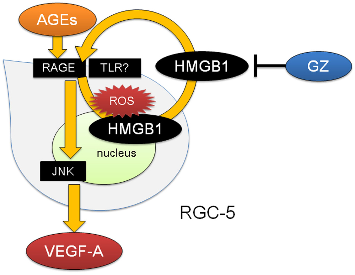 Figure 7. Hypothetic diagram of high-mobility group box protein 1 (HMGB1)-mediated upregulation of vascular endothelial growth factor