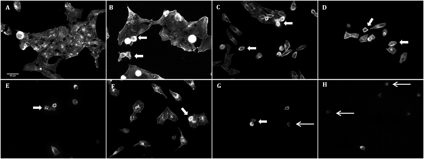 induced cell blebs, cytoplasm shrinkage, and cell detachment in