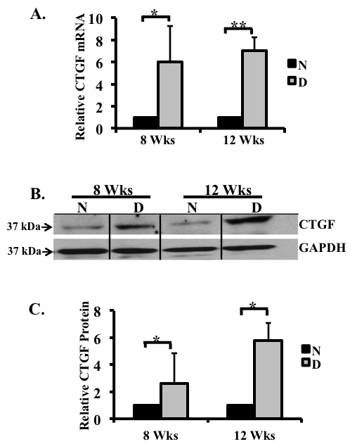 the non-diabetic controls. C: Densitometric analysis of three separate immunoblots indicates a 2.5 and 5.7 fold increase in the CTGF protein after 8 and