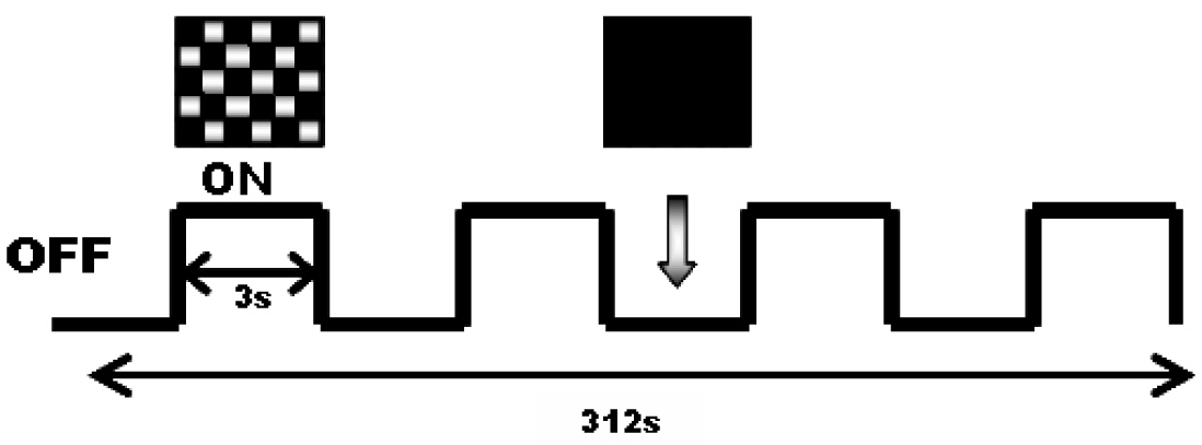 block, a phase-reversing checkerboard pattern was presented, and the “off” block consisted of a black screen with a fixation