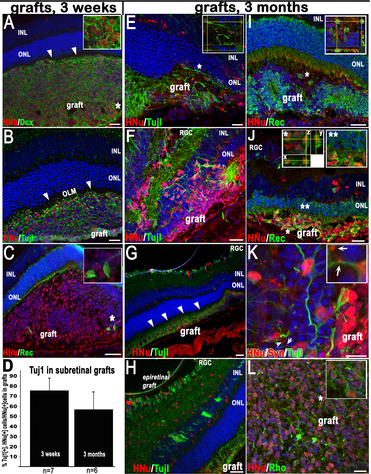 grafts. Immunostaining for A; doublecortin (DCX) and human nuclei (HNu), B; neuronal class III β-tubulin (Tuj1 epitope) and HNu, and C; Photoreceptor (PR) marker recoverin and HNu in subretinal grafts. The asterisks indicate the areas shown in insets. Note