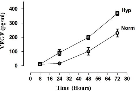 Figure 1. Sustained and cumulative expression of VEGF in hypoxia and atmospheric oxygen. Detection of VEGF levels in hypoxia with ELISA.