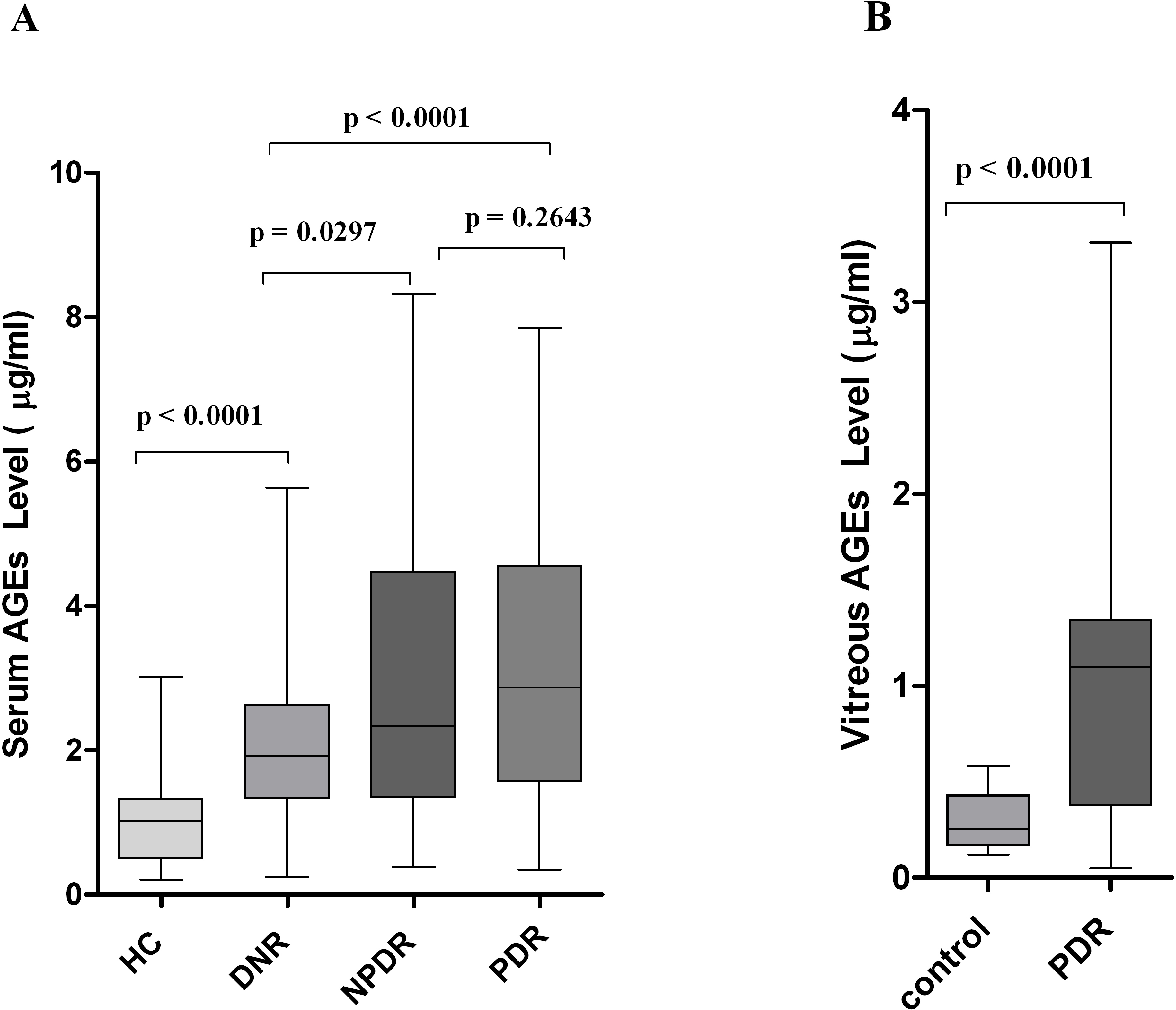 with DNR and from 95 subjects considered as HC. B: The box-and-whisker plot represents the median and minimum to maximum range of vitreous AGE levels (µg/ml) among both the