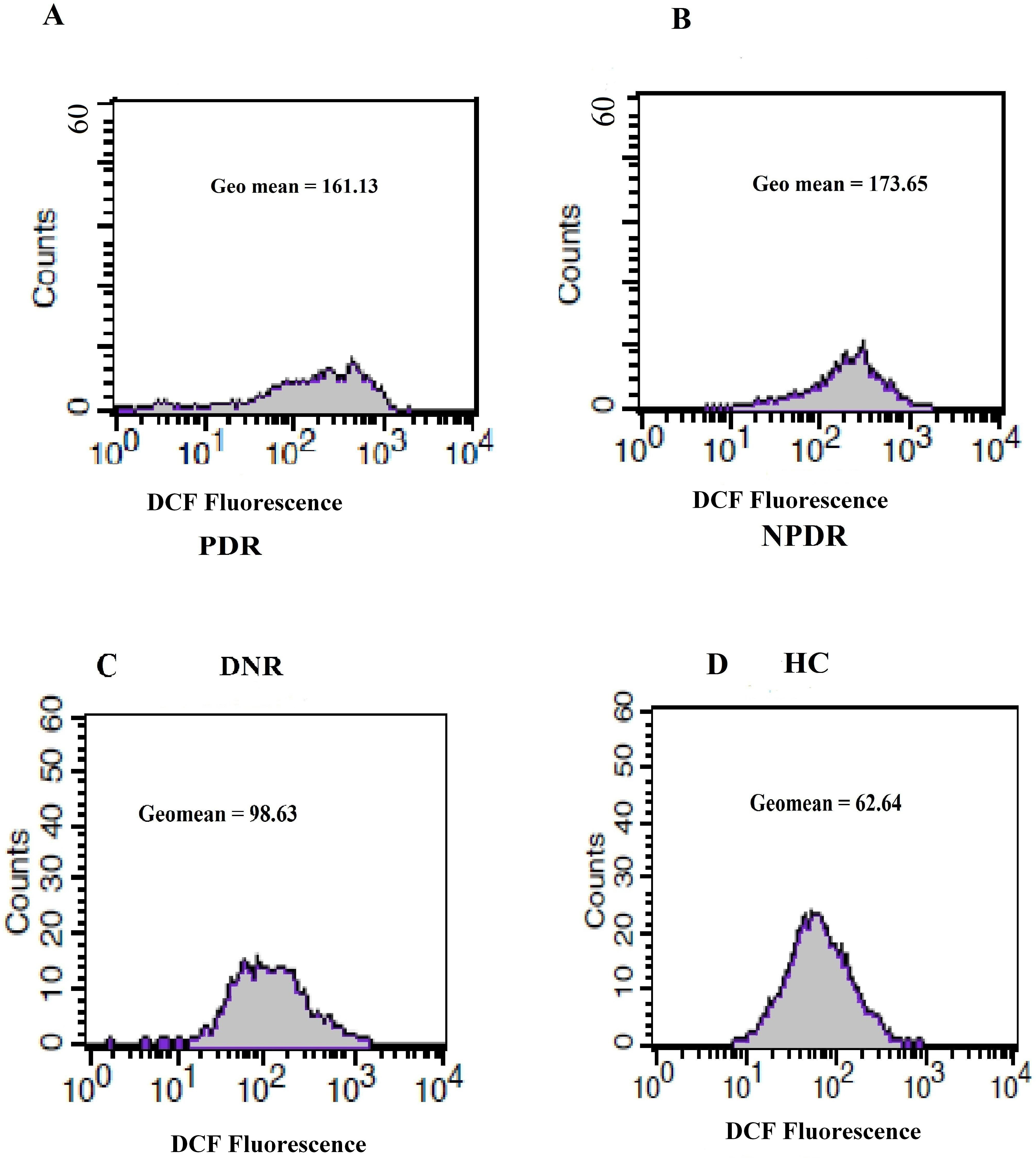 Figure 3. Histogram of peripheral blood mononuclear cell reactive oxygen species (PBMC ROS) level. The histograms in A, B, C, and D represent the geomean of PBMC dichlorofluorescein (DCF) fluorescence as a measure of ROS level among proliferative diabetic