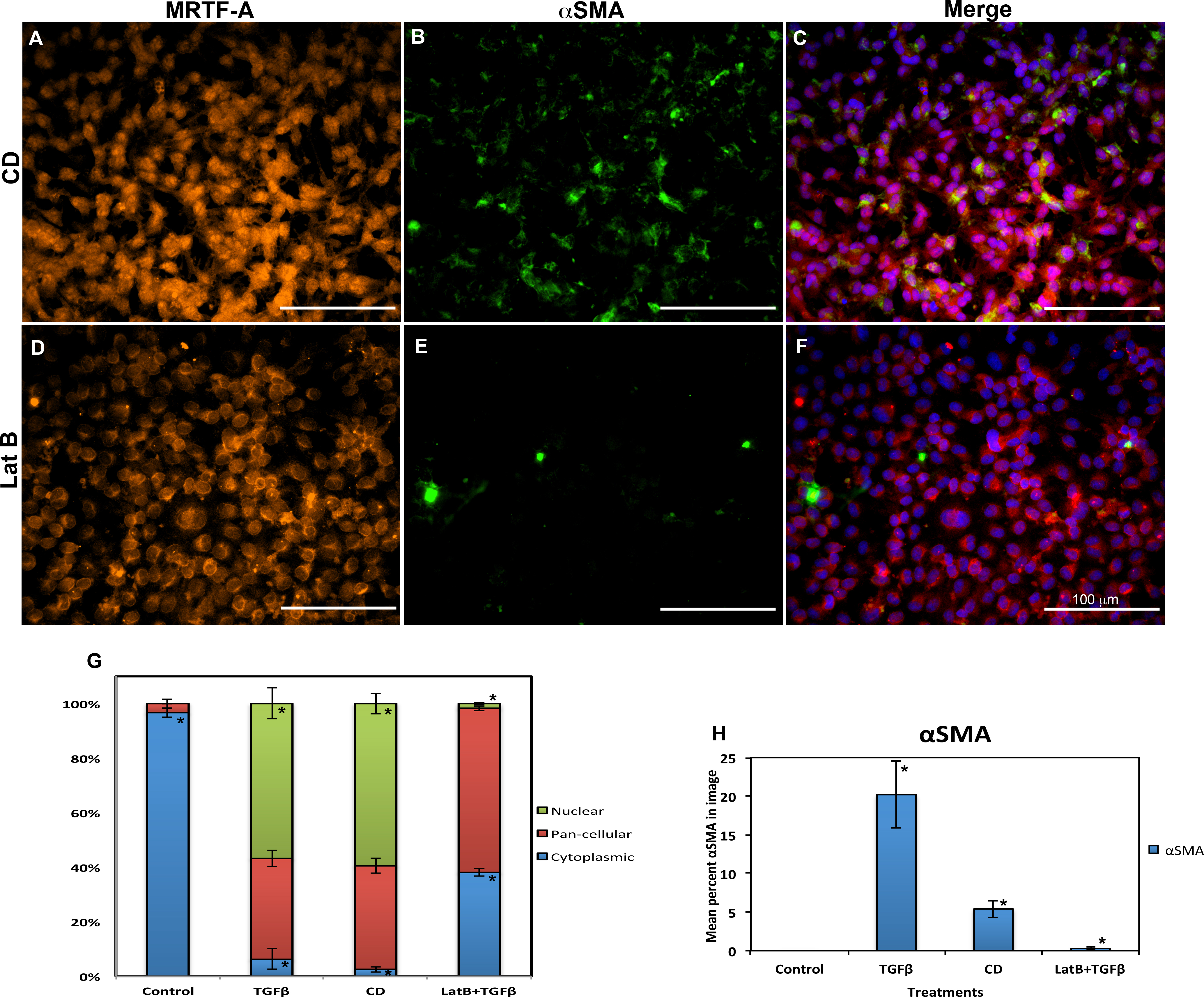 (TGFβ). B: Latrunculin B (LatB)+ TGFβ cotreated cells showing mostly cytoplasmic and pan-cellular MRTF-A (D) with a decrease in αSMA expression (E). As a whole, the LatB+ TGFβ-treated cells greatly resemble the control cells. The corresponding composite picture with DAPI