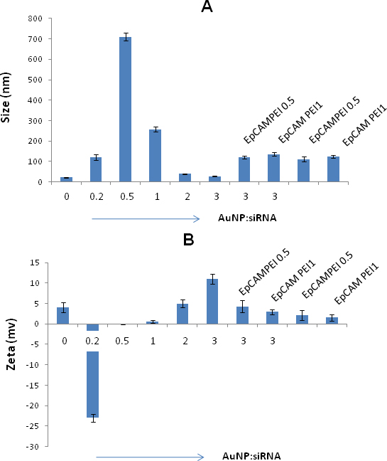 with PEI and EpCAM antibody at a ratio of 0.5 and 1 was 111 and 124, respectively. B: The zeta potential measurements of the AuNPs mixed with siRNA and/or conjugated EpCAM antibody. The zeta potential was almost