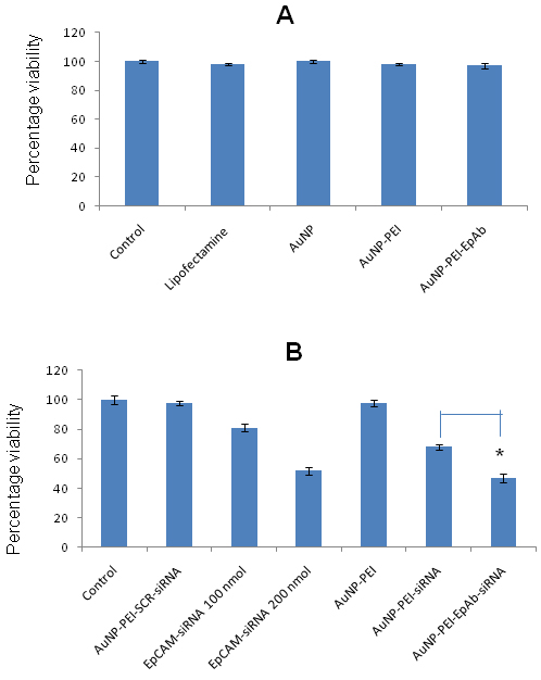treated with AuNP PEI-EpAb loaded with 100 nmol of siRNA showed significantly decreased viability (47%) when compared with