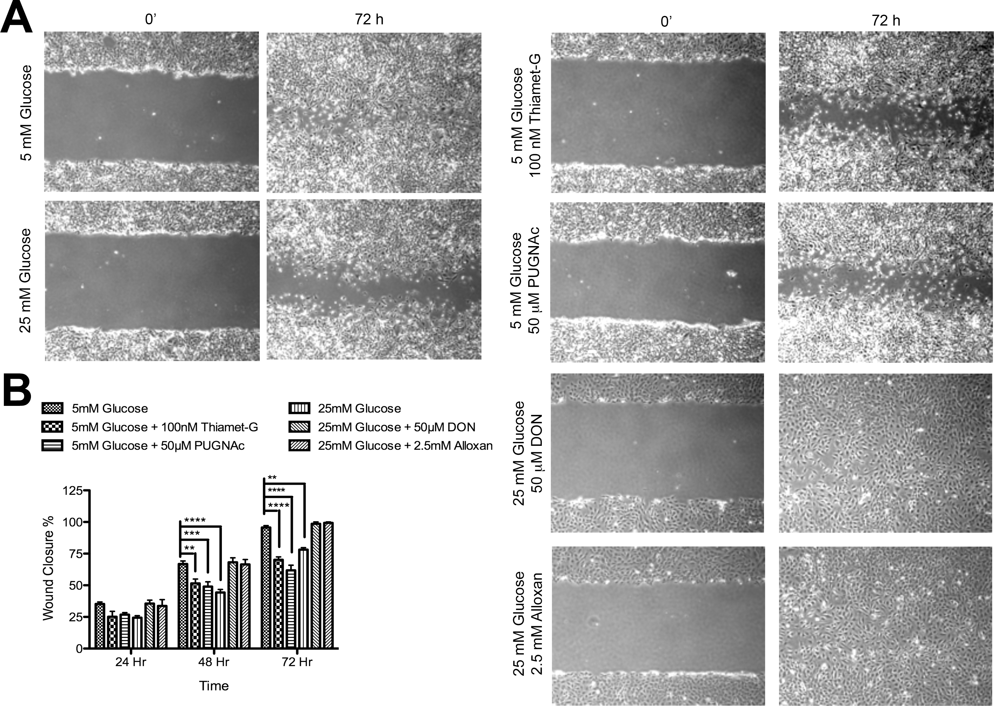A representative experiment is shown here. B: The quantitative assessment of the wound closure (**p<0.01, ***p<0.001, and ****p<0.0001; n=3).