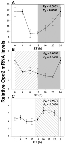 RNA expression levels were quantified by real-time PCR. One-way analysis of variance (ANOVA) and cosinor levels of significance