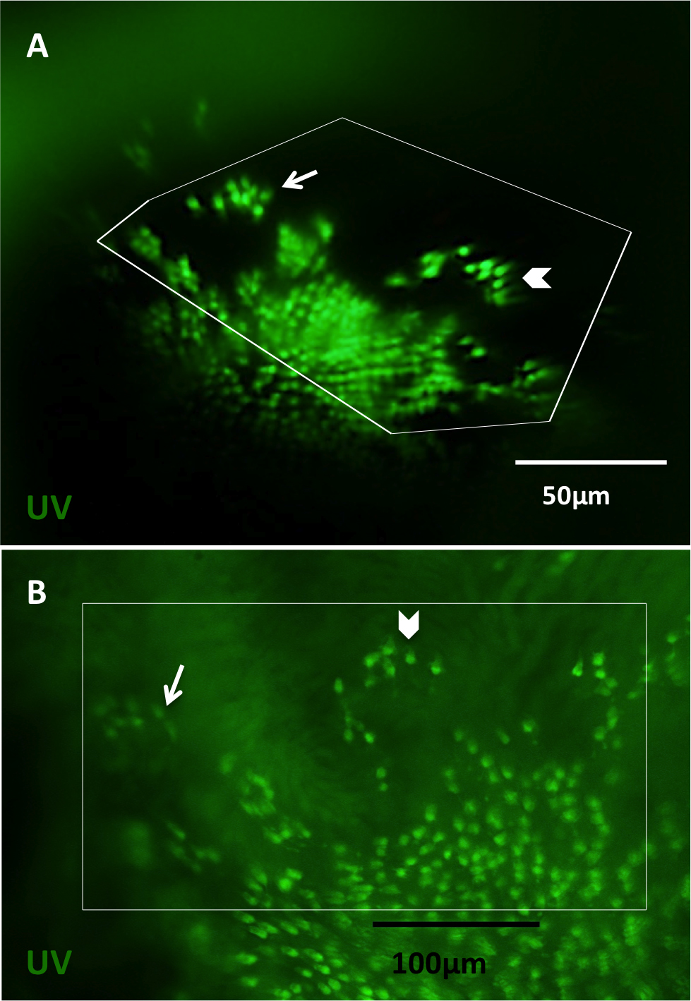 lens [A] were compared to the flatmounted retina dissected away from other ocular tissues [B]. Images A and B show ultraviolet (UV)-sensitive cones in the green fluorescent protein (GFP) channel. White box represent corresponding areas