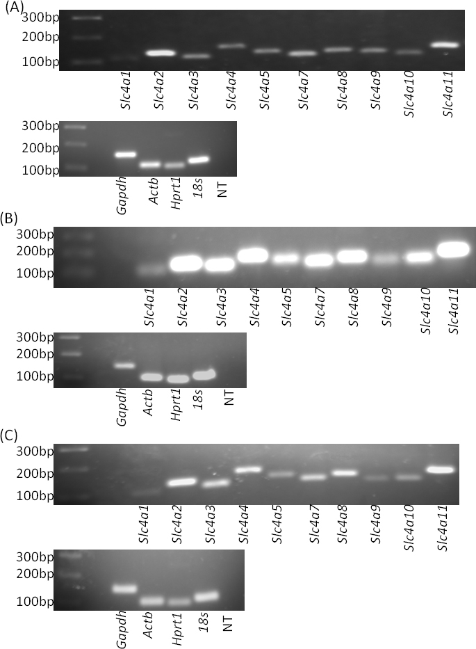 Slc4 gene expression by reverse transcription polymerase chain reactions (RT–PCR). Template cDNA samples were generated from mouse