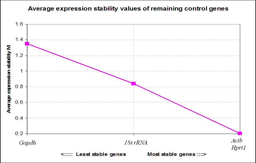 Figure 2. GeNorm™ analysis. The most stable reference genes were selected from the four most commonly used housekeeping genes (Gapdh, Actb, 18s rRNA, and Hprt1) using the geNorm™ software. They were systematically compared with each other, and the resulting average expression stability