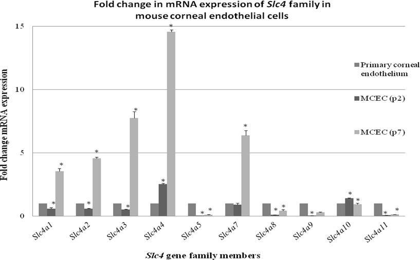 Figure 5. Slc4 gene expression in cultured mouse corneal endothelial cells. The expression of Slc4 genes was compared between cultured cells (passage 2 and 7) and the primary corneal endothelium, which served as the calibrator