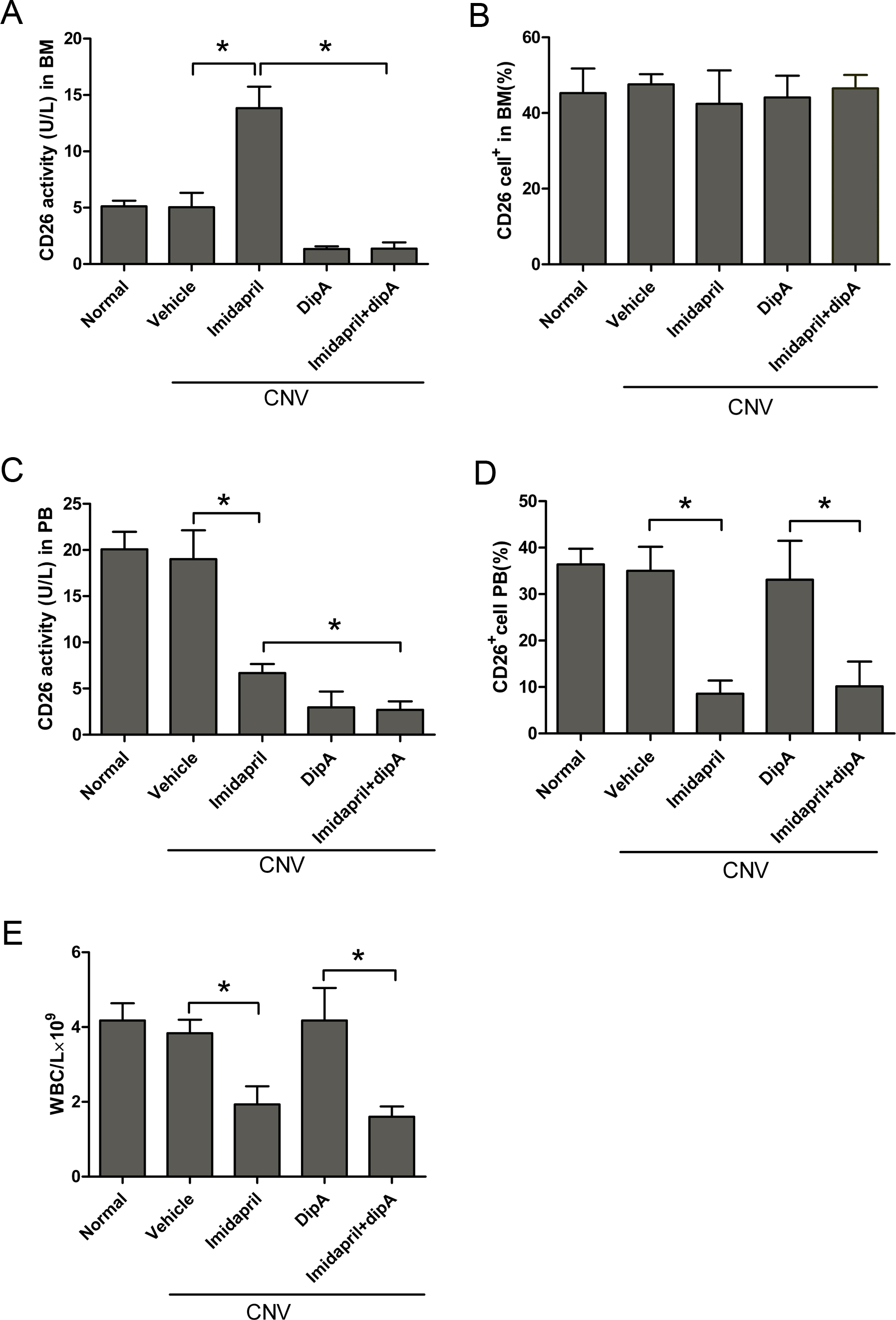 days following laser-induced choroidal neovascularization. CD26 activity in the BM was assessed (A), and the number of CD26+ cells in the BM was determined (B). The plasma CD26 activity was measured (C), and the number of circulating CD26+ cells in the peripheral blood (PB) was determined (D). The number of white blood cells (WBCs) in the PB was measured (E). The values are expressed as the mean±standard deviation (n=5). The asterisk (*) indicates p<0.05. Dip-A represents diprotin-A.