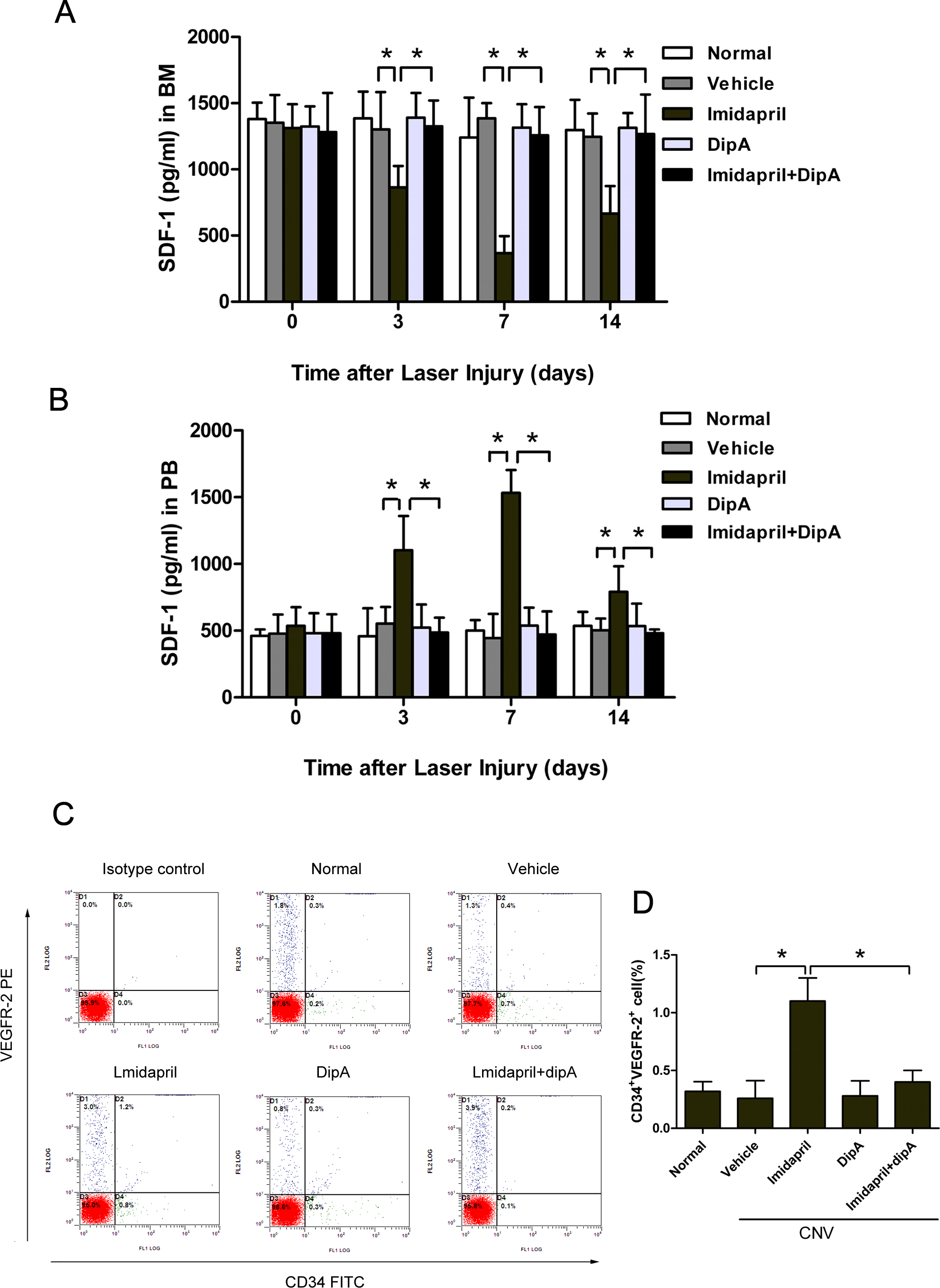 factor (SDF)-1 protein expression in the bone marrow supernatant (A) and the plasma (B) was determined using ELISA 0, 3, 7, and 14 days following laser-induced choroidal neovascularization (CNV). C: Representative fluorescence-activated cell sorting (FACS) data, based on which the CD34+/ vascular endothelial growth factor receptor 2 (VEGFR2)+ cells within the nucleated cell fraction of the peripheral blood from the different treatment groups were determined to be