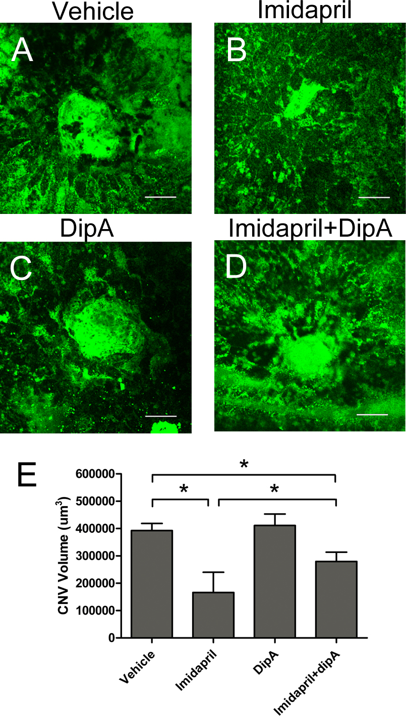 (A), imidapril-treated (B), diprotin-A-treated (C), and imidapril plus diprotin-A-treated (D) mice are presented. The newly formed blood vessels that make up the choroidal neovascularization (CNV) were stained by isolectin-B4