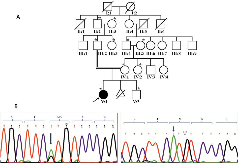 substitution of G>A (c.649G>A) in the proband (right panel) whereas the unaffected mother was heterozygous for the same (left