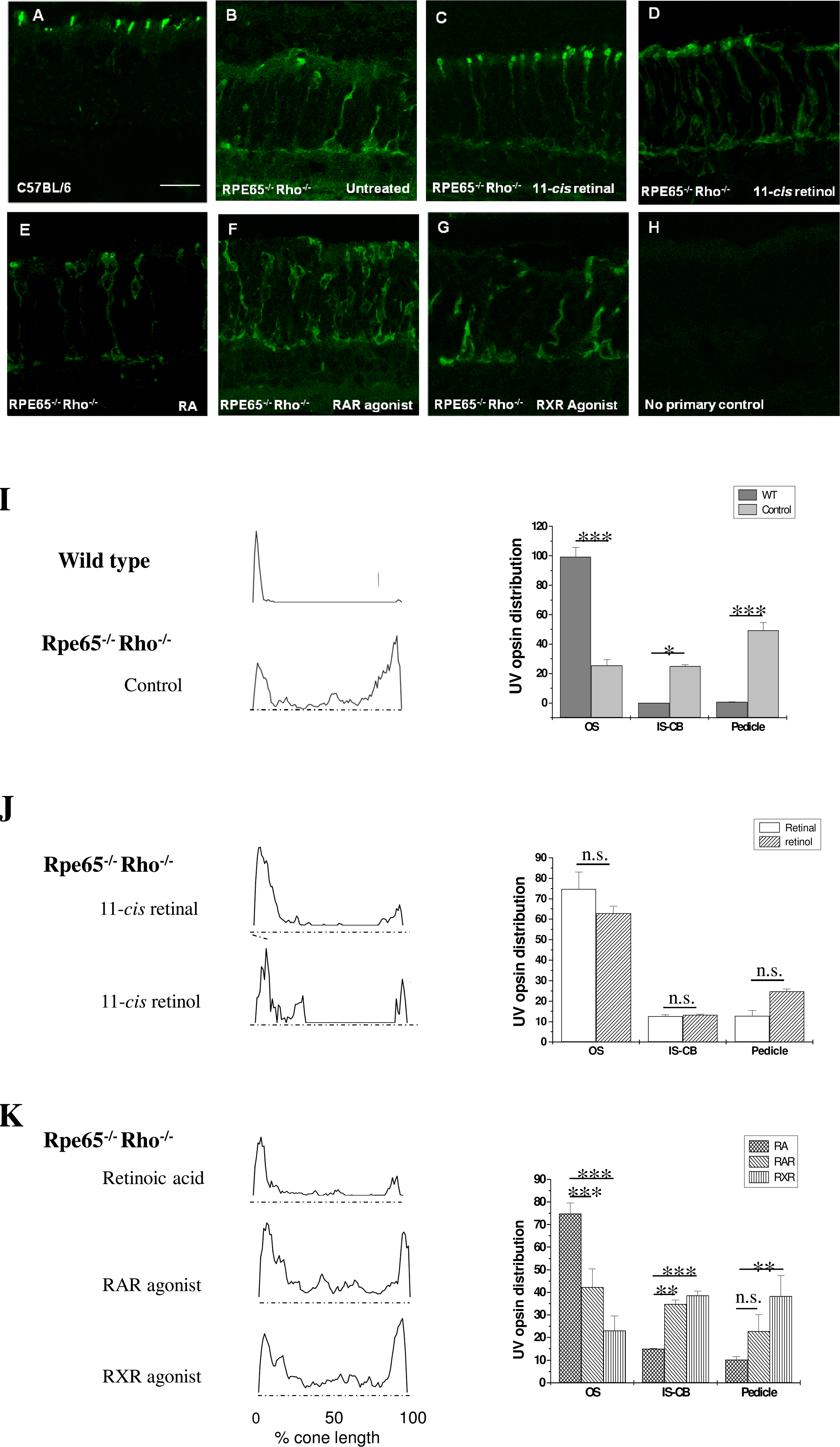with a minor amount trafficked correctly to the cone OS. C: Exogenous supplement of 1 μmol 11-cis retinal, or (D) 1 μmol 11-cis retinol to Rpe65−/− Rho−/− explant cultures improved trafficking of UV–cone opsin toward the target site. Trafficking of UV–cone opsin in Rpe65−/− Rho−/− explant cultures did not improve significantly upon treatment with (E) retinoic acid (RA; 500 nmol), (F) retinoic acid receptor (RAR)-agonist (AM80, 1 μmol) or (G) retinoid X-receptor (RXR)-agonist (SR11345, 1 μmol). H: No primary antibody control is provided to document non-specific binding of the secondary antibody. I: UV–cone opsin distribution profiles and quantitative assessment in wild-type and Rpe65−/− Rho−/− explants. Protein distribution profiles were obtained from binarized and thresholded images normalized to a fixed size using