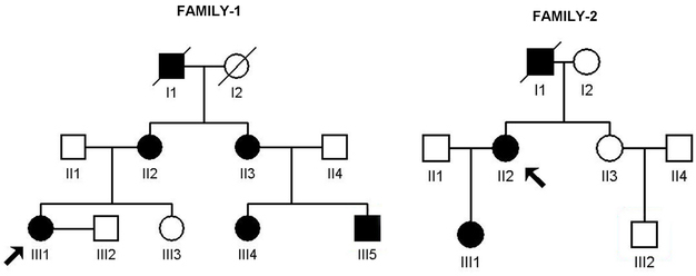 and circles, respectively. Normal individuals are shown as empty symbols. Deceased individuals are indicated with slashes