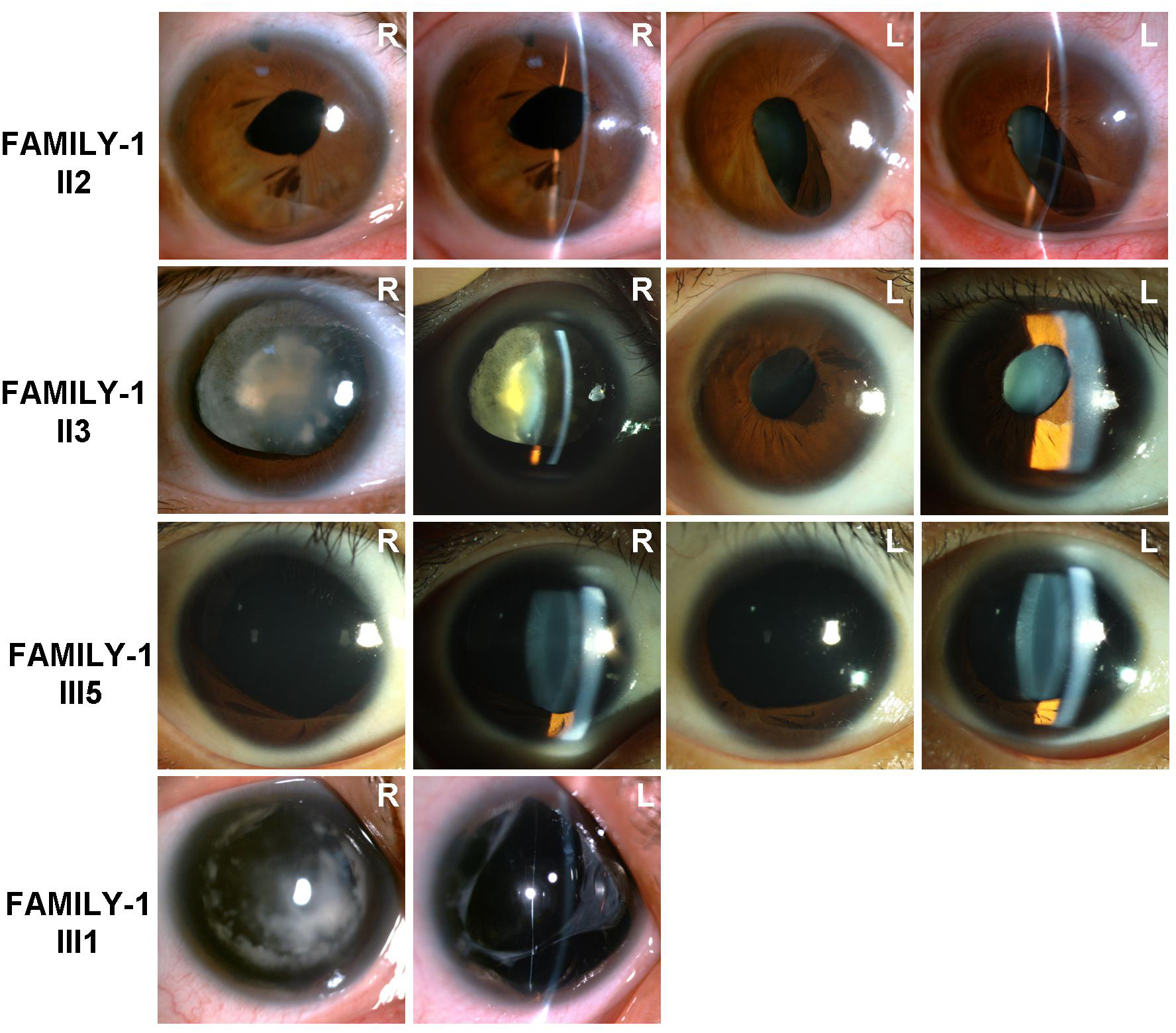 Slip-lamp photographs of the affected individuals in FAMILY-1. The phenotypes are described and summarized in Appendix 1. R: right eye, L: left eye.