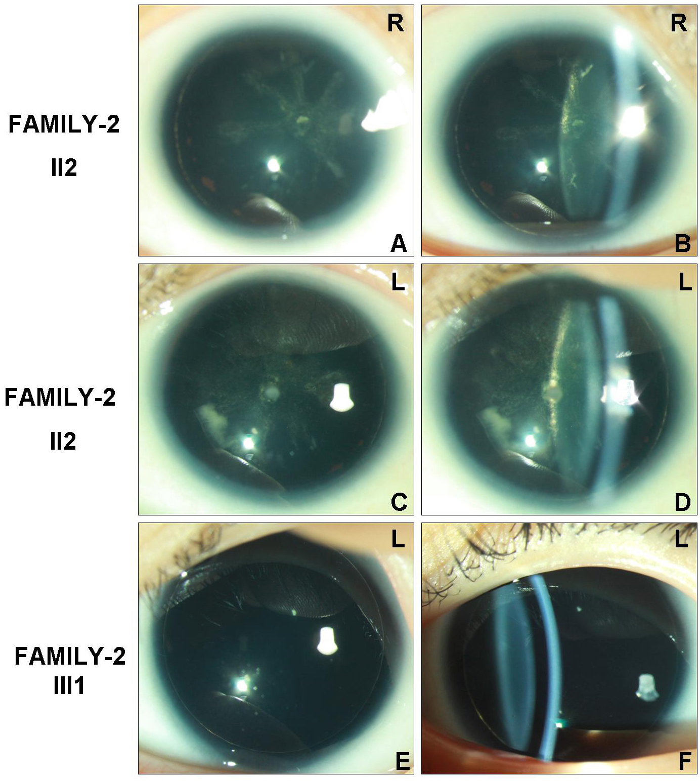 Slip-lamp photographs of the affected individuals in FAMILY-2. The phenotypes are described and summarized in Appendix 1. R: right eye, L: left eye.