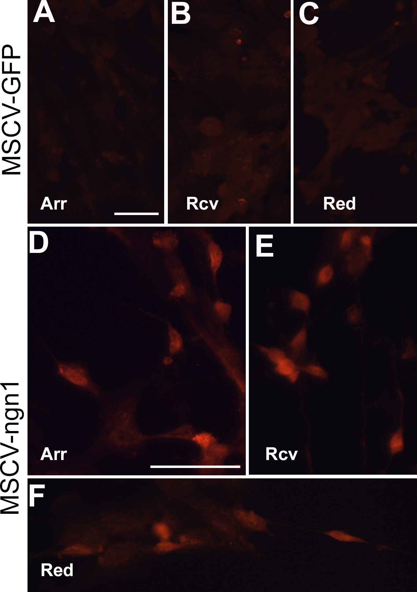 for retinal cone arrestin 3 (Arr; A), recoverin (Rcv; B), and red opsin (Red; C) and in the experimental culture transfected with MSCV DNA expressing human neurogenin1 (MSCV-ngn1) of each protein (D-F). Scale bars are 50 μm.